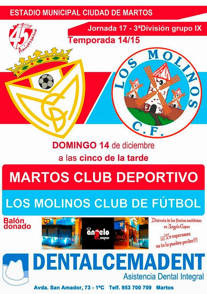 El Martos Club Deportivo recibía al colista con cierta cautela, Los Molinos CF es un equipo que había logrado doblegar al líder y un exceso de confianza podía ser contraproducente. Pronto encarriló el partido, en una internada por banda derecha de Luque, el buen centro de éste no pudo aprovecharlo ni primera instancia Vitu, ni en el segundo palo Ezequiel, pero el colegiado no le tembló el pulso y señaló penalti por empujón del defensa visitante al delantero marteño. Corría el minuto cuatro de partido y Vitu se encargó de transformarlo en gol, dedicándoselo a lesionado Miguelillo, que tras romperse el ligamento cruzado de una de sus rodillas estará de baja el resto de la temporada.. El Martos CD dominaba completamente el partido, prueba de ello es que los visitantes ni se acercaron a la meta de Miguel en toda la primera mitad, en la que no tuvo que intervenir para nada. Pasado el cuarto de hora de encuentro Vitu vuelve a marcar, ampliando en marcador. El buen juego local, que no aflojaban en su presión a la salida del balón del rival, pese a la ventaja en el marcador, hacía que las ocasiones se sucedieran y en el cuarenta y uno Ezequiel volvió a marcar, subiendo el tercero al marcador. Cuando parecía que con el tres a cero se iba a llegar al descanso, en el cuarenta y tres, Vitu consiguió su hat-trick, subiendo el cuarto al marcador.